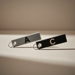 Su diseño limpio y elegante lo convierte en un accesorio perfecto para llevar en las llaves, en el bolso o en la mochila, y su personalización mediante grabado láser hace que cada pieza sea única y especial.