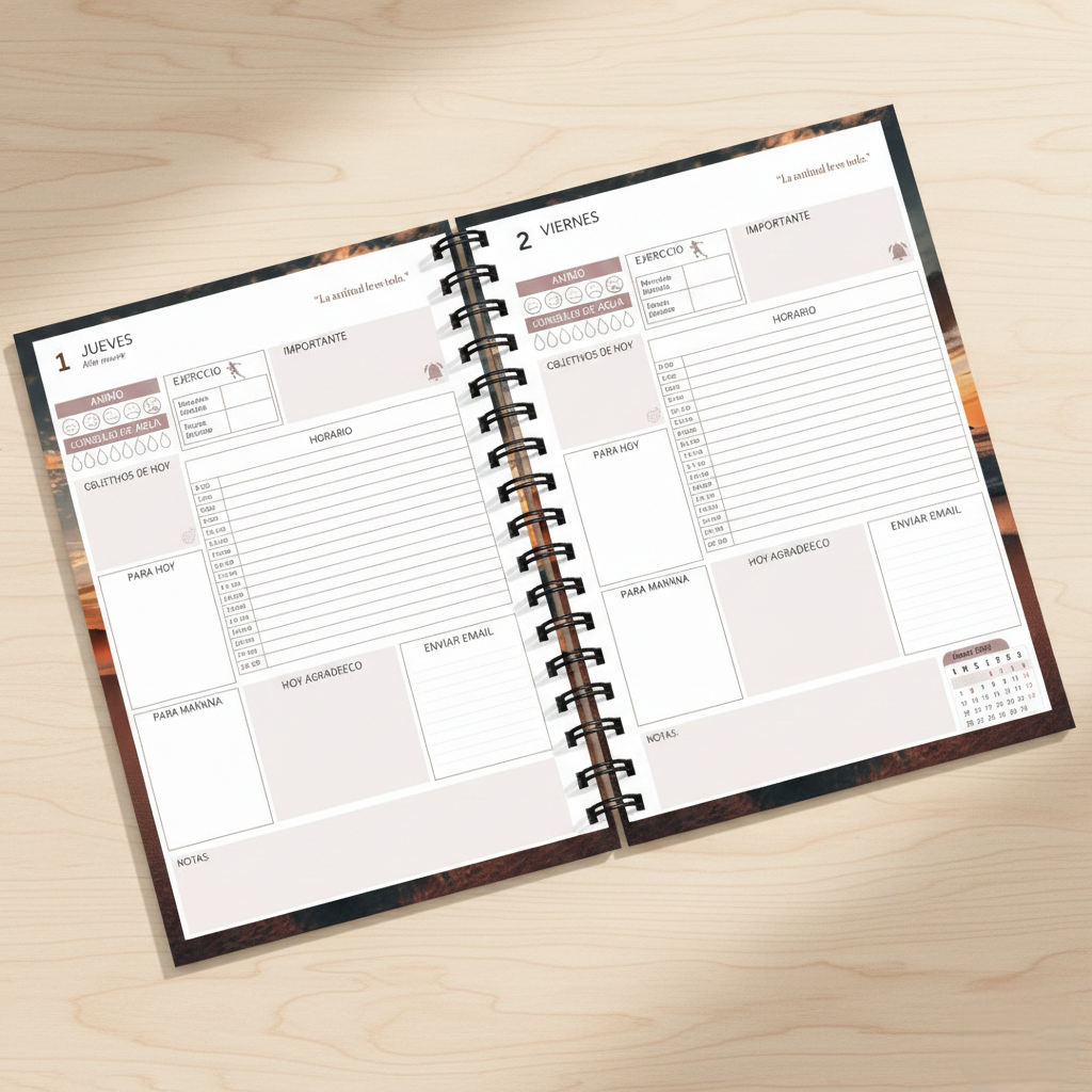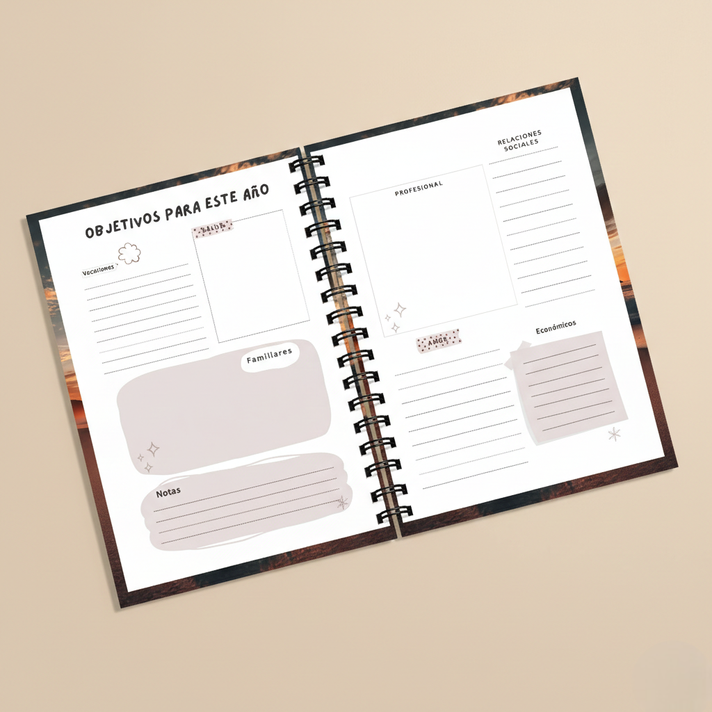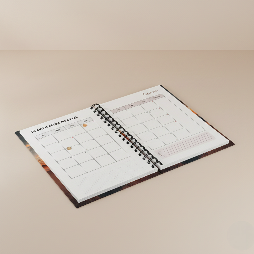 - Incluye: Portada personalizada, calendario anual, páginas extra, separadores