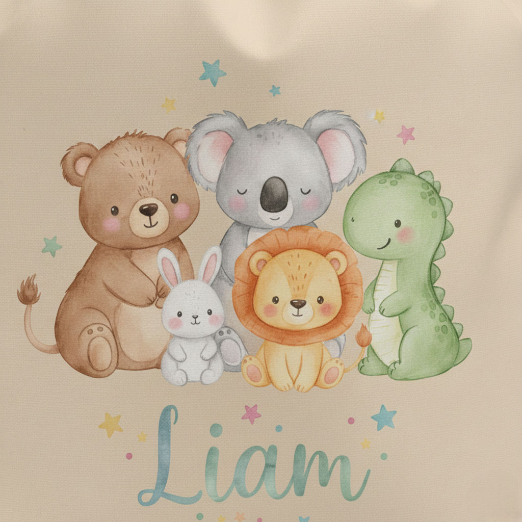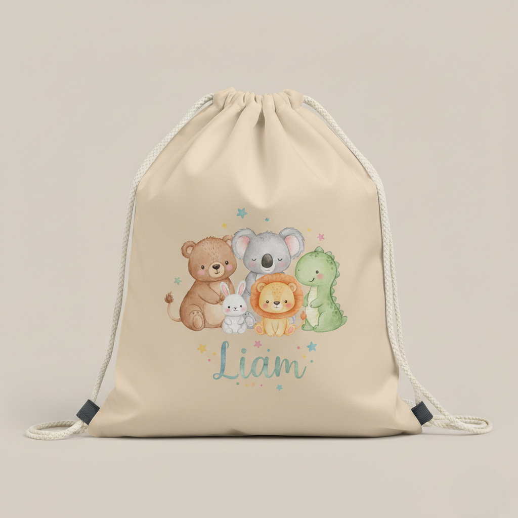 La mochila saco algodón infantil con nombre y animalito es perfecta para los peques que necesitan una mochila ligera, cómoda y personalizada con un diseño tierno y divertido. Su tejido de poliéster blanco permite una sublimación total con colores vivos y nítidos, ideal para ilustraciones infantiles como ositos, conejitos, dinosaurios, leones, koalas y muchos más.