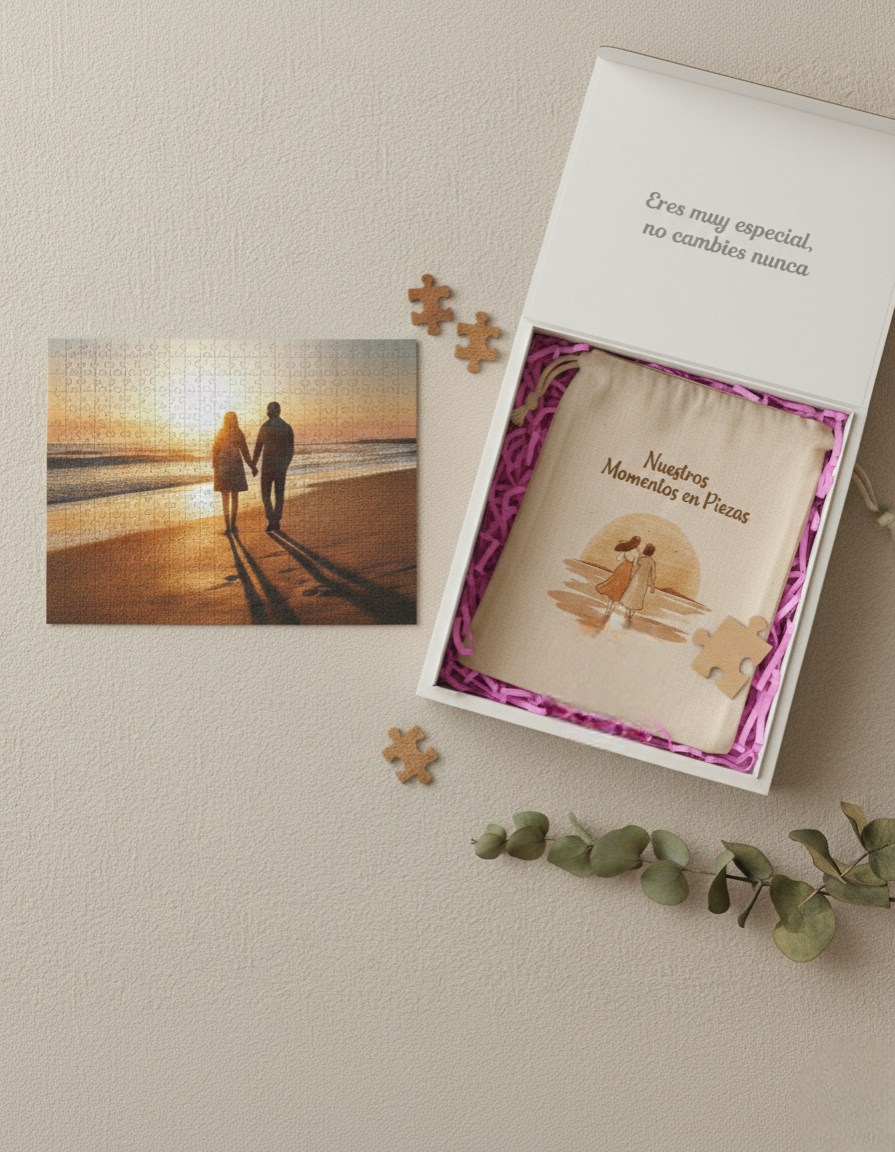 Este pack está diseñado para sorprender desde el primer momento. Nuestro puzle personalizado con caja regalo incluye un puzle con tu foto favorita una bolsa de lino tipo saco y una caja regalo que convierte el conjunto en un detalle elegante, emotivo y listo para entregar.